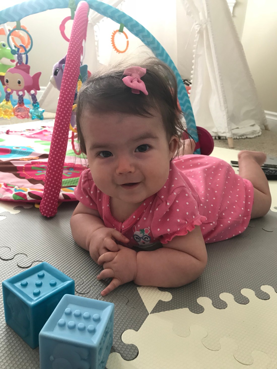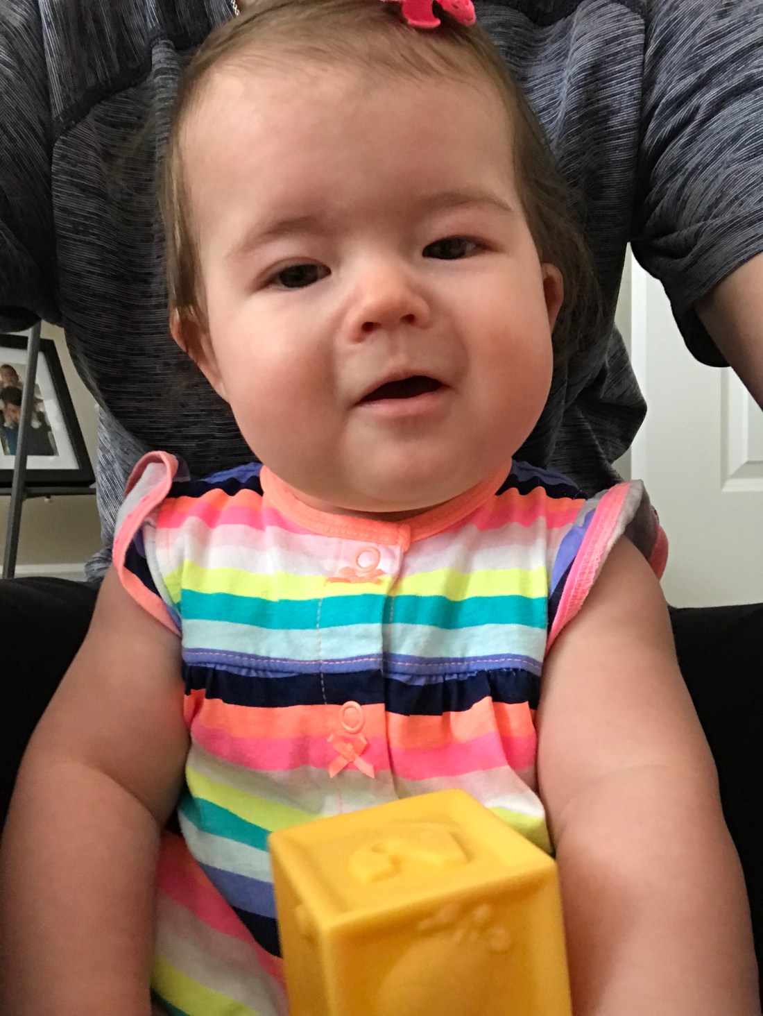 Ava is continuing to grow and develop. She now weighs 17 lbs 5 oz , 65 cm long. She loves tummy time and playing with her toys. Her favourite word is still “mum”. It also looks like more teeth are coming in!