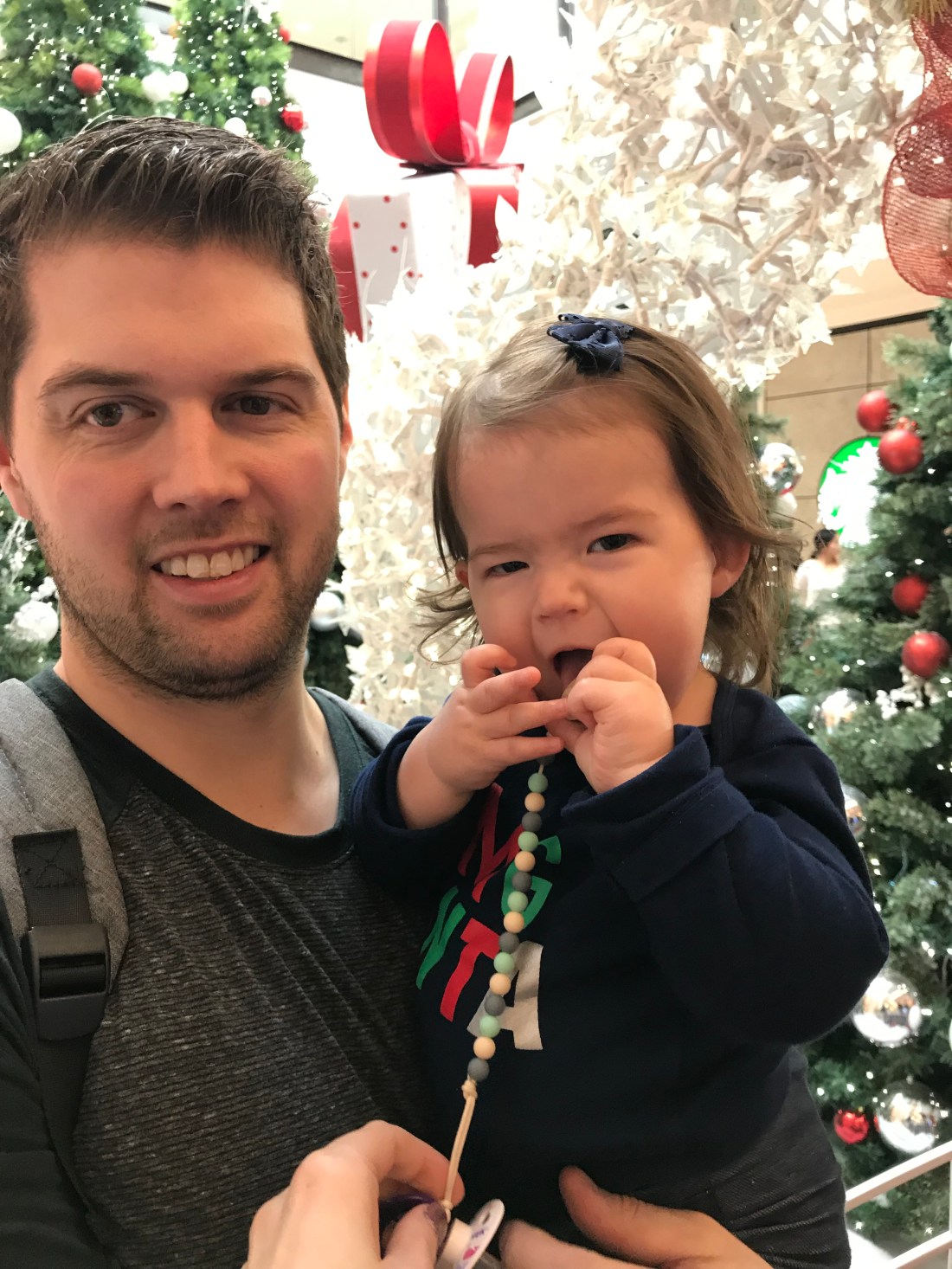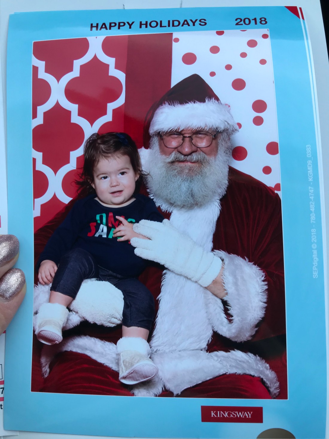 We took her last week to go get her picture with Santa – at Kingsway, which was a lot of fun. It felt so “normal” of what a toddler should be doing. It was nice to be out as a family. Landon and I both really enjoyed it. Thank gosh for some ideal ‘family washrooms’ as it can be challenging to manage an ostomy while out- and with a second medical bag full of supplies. It is our goal as a family to go out more, do more outings.