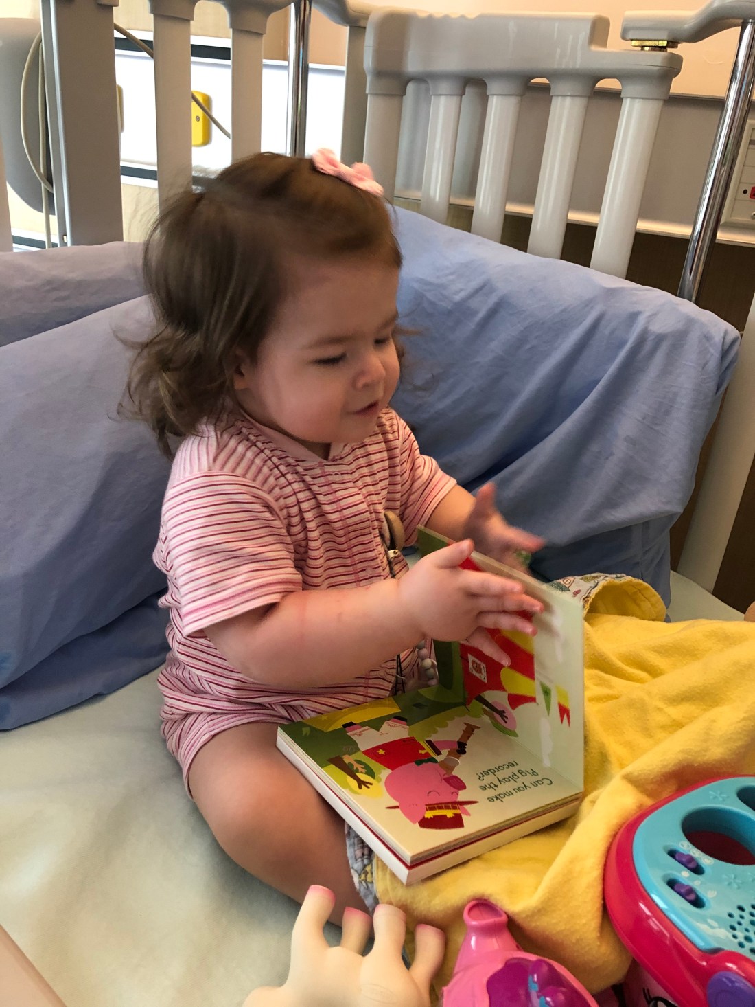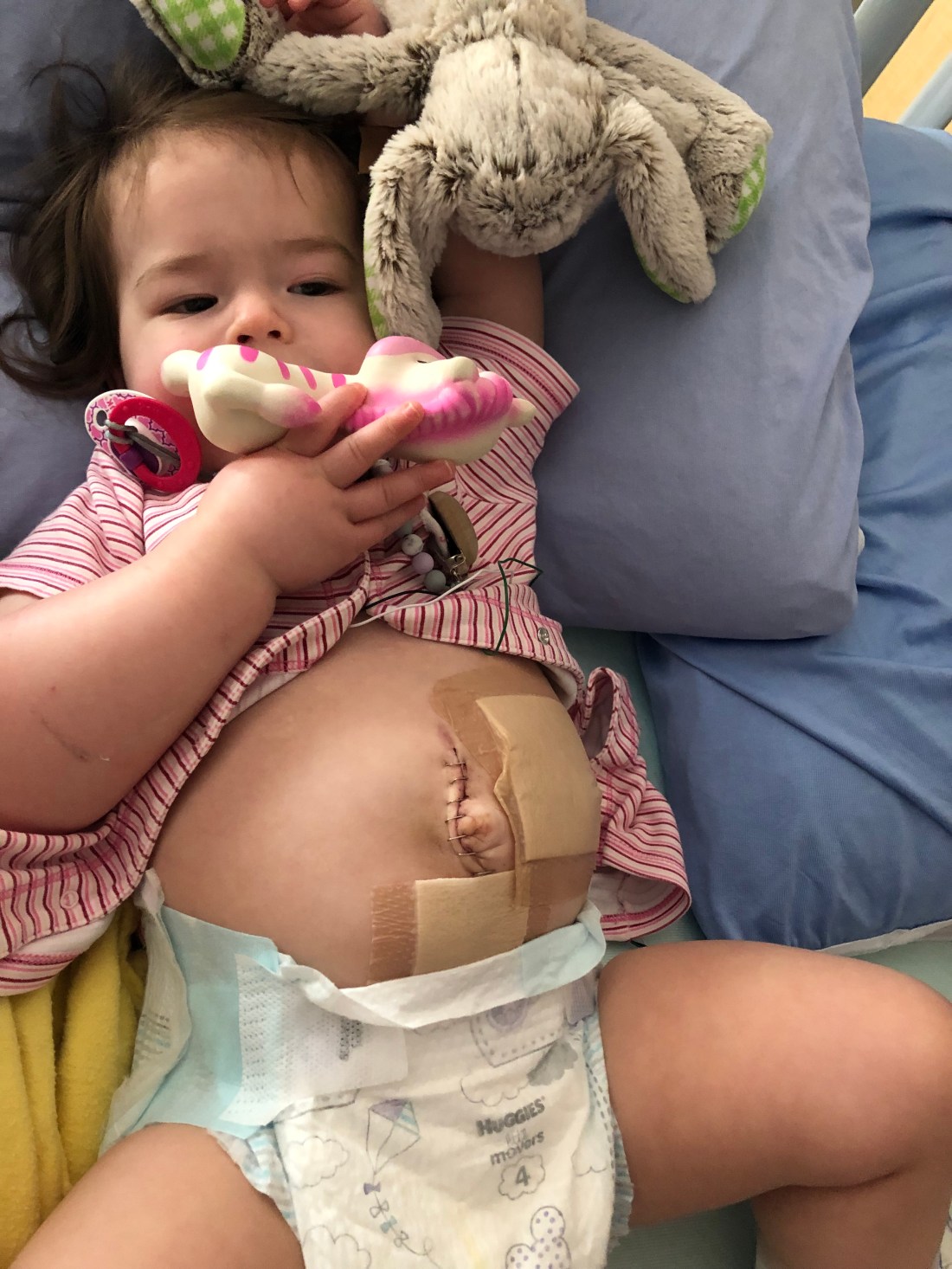 We are still on the ward in peds surgery 4D. She has been more active and playful. It’s so nice to see her more like herself. It’s been slow and steady, but positive progress with Ava. Last night at 3 am her IV went interstitial (out of the vein) which was very painful for her because of the potassium and narcotics that were infusing 😞. She is a very hard start. Once they got another in she was able to fall back asleep. Her incisions to her abdomen are looking good. We were able to wean her off the dilaudid pain medication today. Will be managing the withdrawals from that. She has been so tough and has been amazing us with her strength❤️. She has passed more gas today🙏🏼 we have never been so excited to hear a “fart” haha. And she even had a small poop smear🙏🏼. Her bowels are taking their time “waking up” from the major surgery. We are still all on our toes and holding our breath waiting to see her bum fully work. The surgeon explained today to Landon and I that Ava will have constipation issues as her bum hole has so much scar tissue and is constricted. But one step at a time.. and waiting for some poop action 🤞🏼🙏🏼. We were allowed to take her for a stroller ride which she enjoyed. She was allowed a couple ounces of pediasure today which she enjoyed. Cartoons such as peppa pig and dinopaws are her current favourite. Will continue to keep u all updated. Thanks once again for all the love and prayers ❤️❤️
