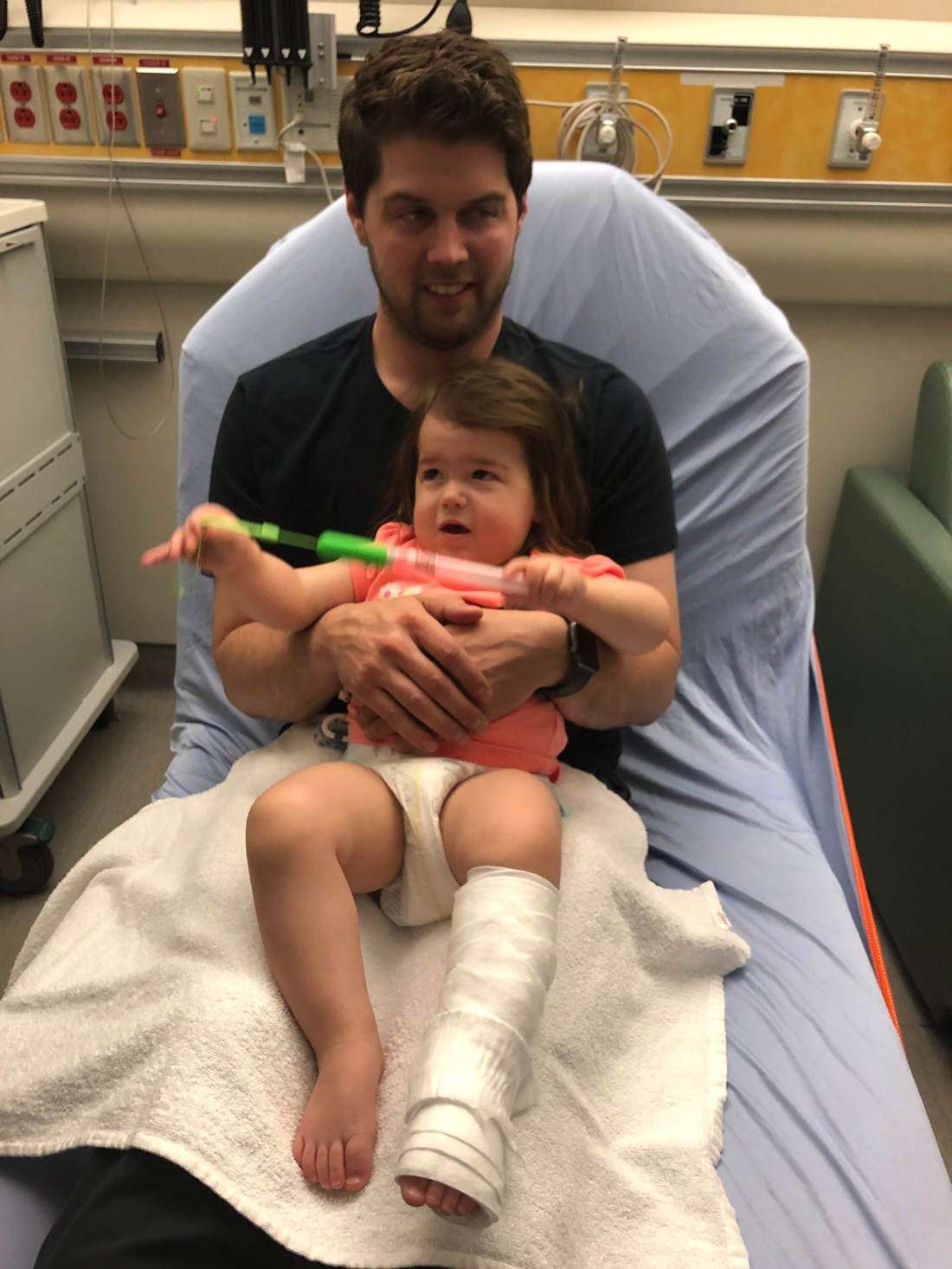 So today we ended up in the Stollery emergency.. and ended up coming home with a cast. Ava broke her leg😩😭. OF COURSE this had to happen. She broke her tibia and fibula- a buckle fracture. We had an accident at home and she fell off the change table onto her side… Thankfully she didn’t hit her head first. She has such a high pain tolerance that it’s so hard to tell how much really hurts! She was such a trooper today with x-rays and when they put her cast on. Of course we needed a ‘pink’ one 💁🏽♀️.